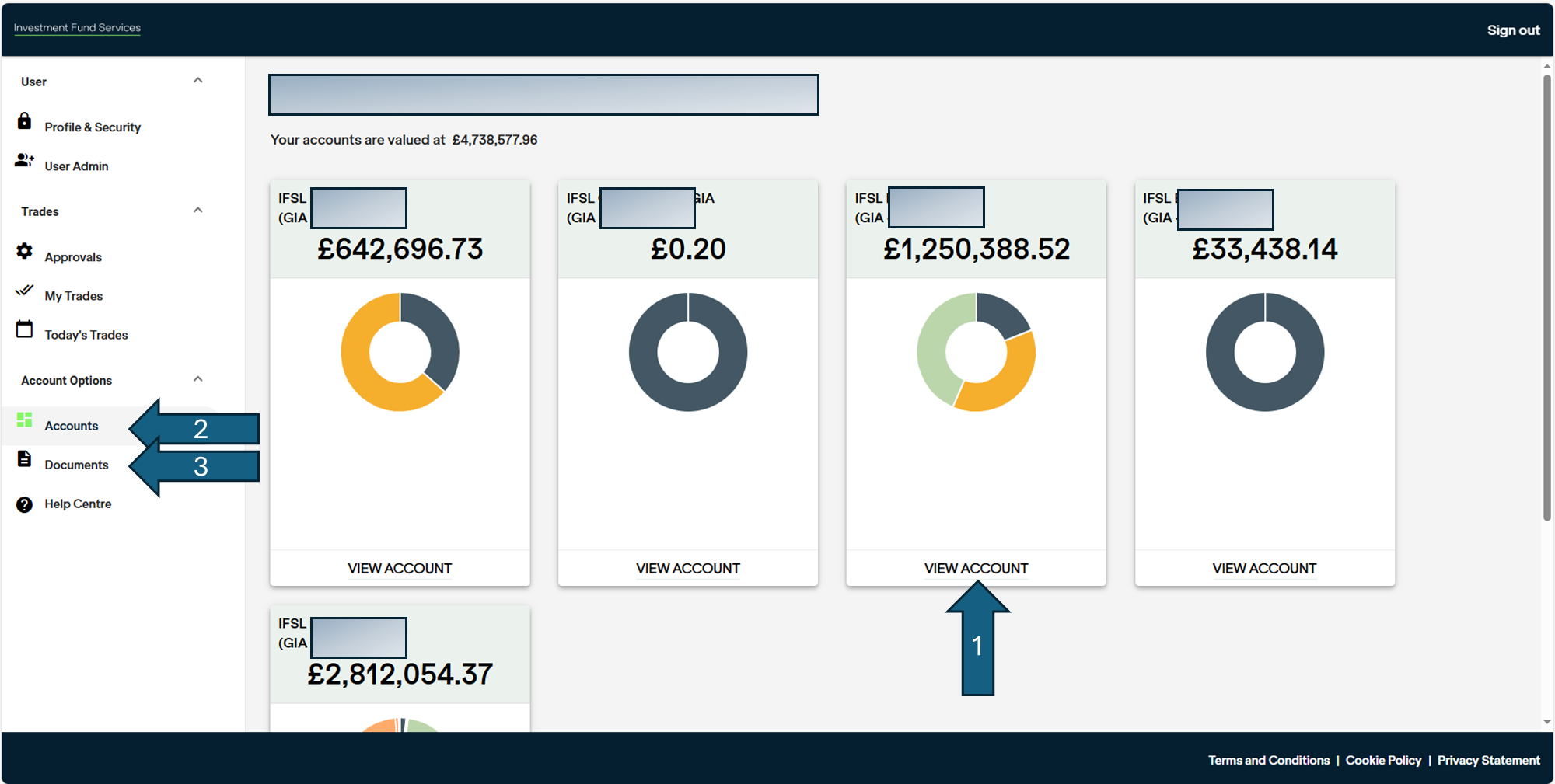 The Accounts option provides a high-level dashboard view of the active investment account(s) you hold with IFSL, including the valuation at the last available valuation point.