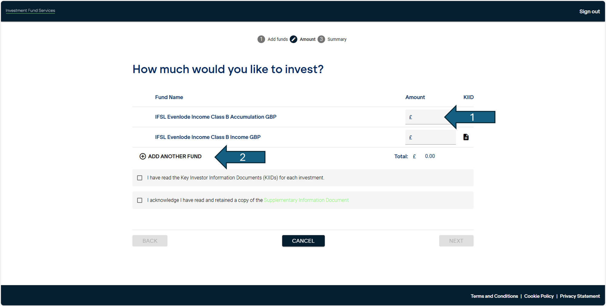 1. If you wish to invest further money into an existing fund, enter the monetary amount to be invested into the Amount box. Simply leave the Amount field blank if you don’t wish to invest further money into an existing fund.
