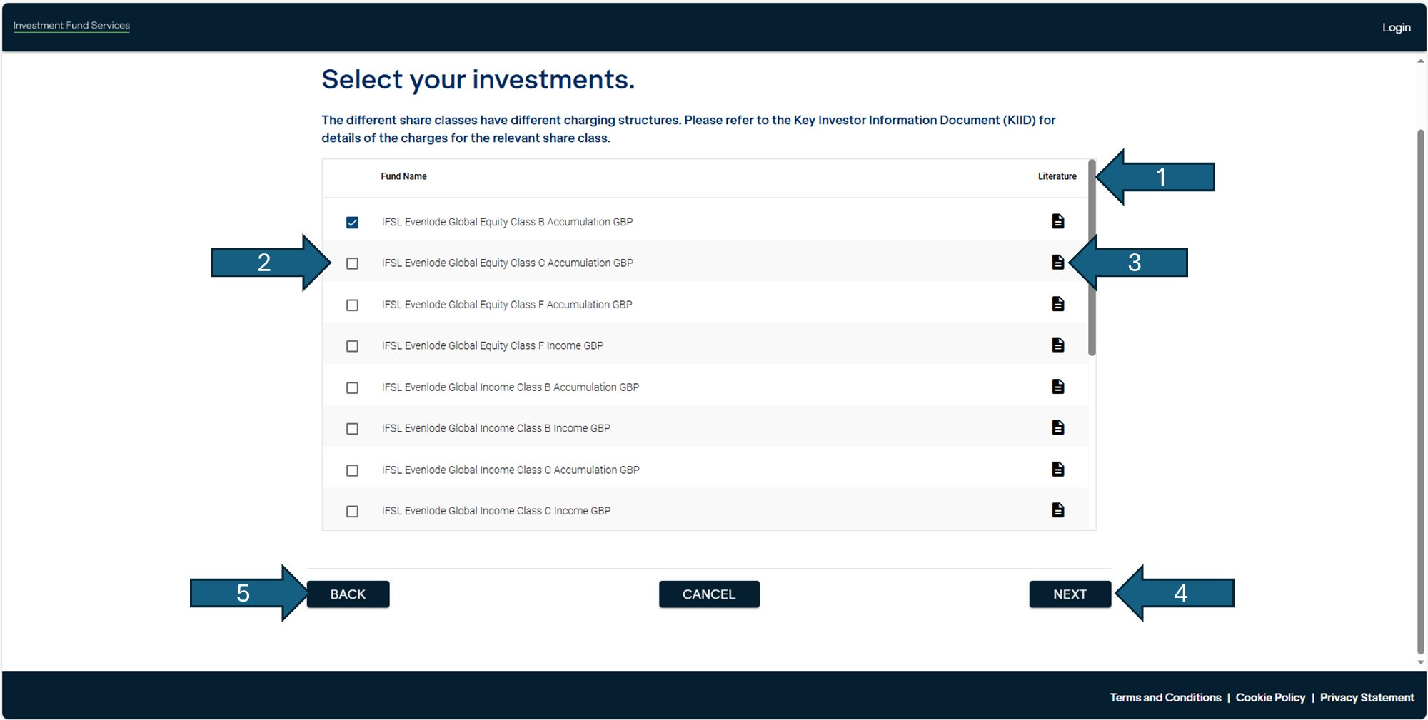 3. Select the Literature icon to view a Key Investors Information Document (KIID) about the fund you are selecting. This can be downloaded and saved. It is important to read this document carefully before investing into the fund, and later in this process you will be prompted to confirm that you have read the KIID before the transaction can proceed.