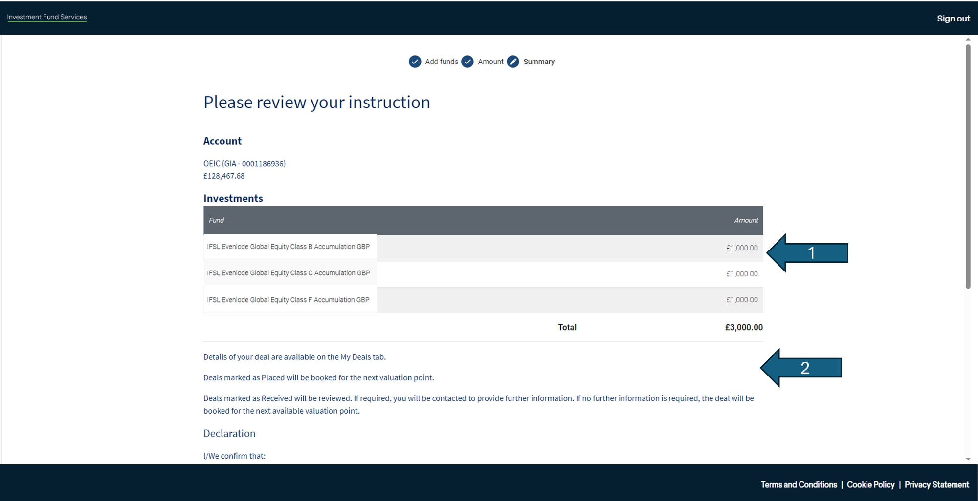1. The funds chosen, amounts to be invested and income preferences selected are summarised for you to review.