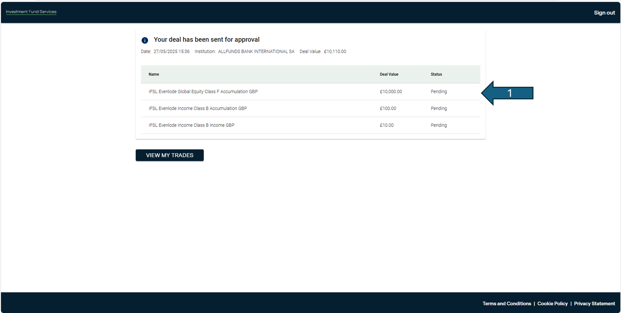 After submission, a confirmation will display that your transaction has been sent to an approver, for final checking and to submit the trade for processing.